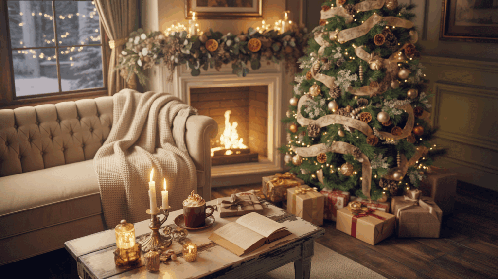 Soft creams, deep greens, antique gold, and cranberry red instantly create that Vintage Christmas Aesthetic we all love. Skip the glittery neon and instead mix muted metallics, aged brass, and warm candlelight. Pro tip: Layer textures — think velvet ribbons, knit throws, and aged wood — to add visual depth and cozy warmth.