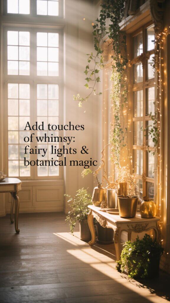 Cottagecore decor often includes small, magical details — fairy lights, framed botanical prints, or vintage birdcages.