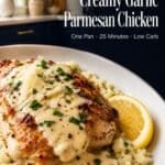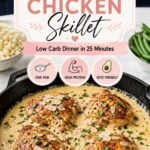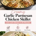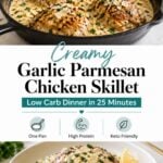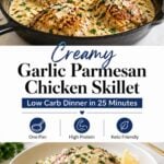 Keywords: creamy garlic parmesan chicken skillet, low carb chicken dinner, keto chicken skillet, one pan chicken, easy low carb dinner, high protein low carb dinner, 30 minute low carb dinner