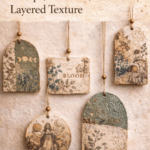 Clay stamps can add words, botanical details, moon phases, floral patterns, mandalas, initials, and decorative motifs. Some stamps are deep and bold, while others create delicate impressions. You can stamp directly into rolled clay before drying or baking, then leave the impression plain or highlight it later with paint, wax, or a Rub ’n Buff style finish.