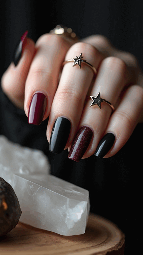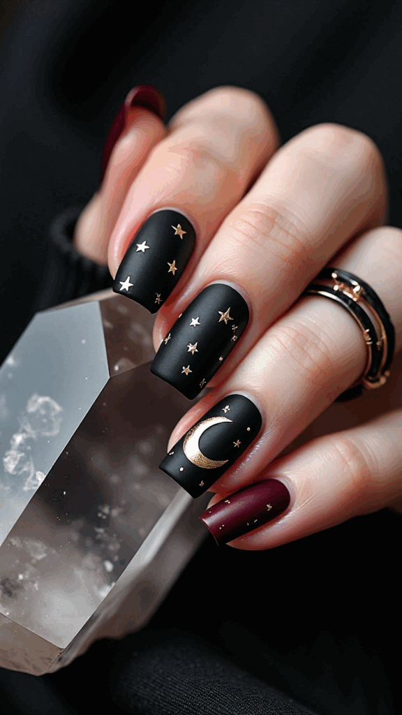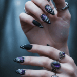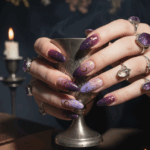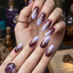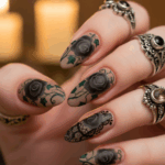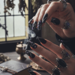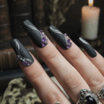 Witches and vampires aren’t just costume ideas—they’re a full aesthetic. Witch nails combine deep tones like black, plum, and burgundy with mystical accents. Try chrome tips, crescent moon charms, or matte finishes for an elegant Gothic touch.