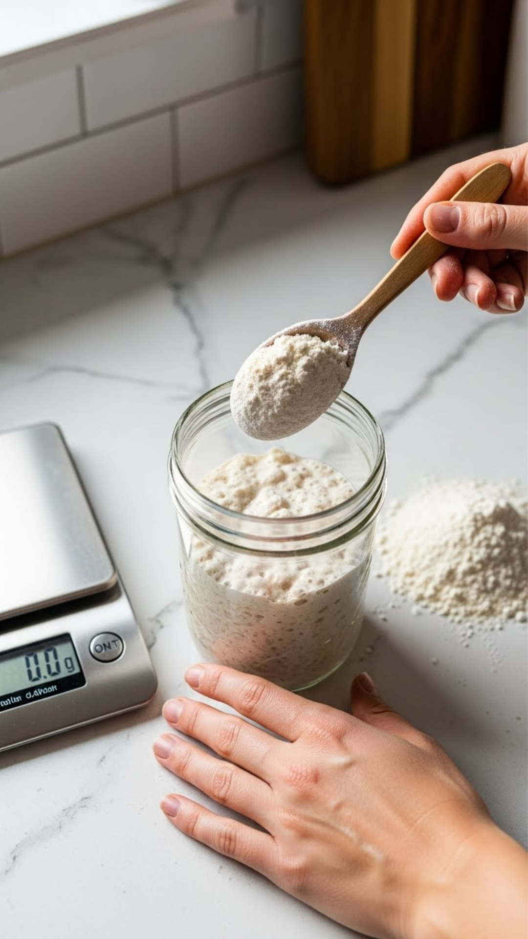 • Add equal weights of flour and water (1:1:1 ratio with starter)