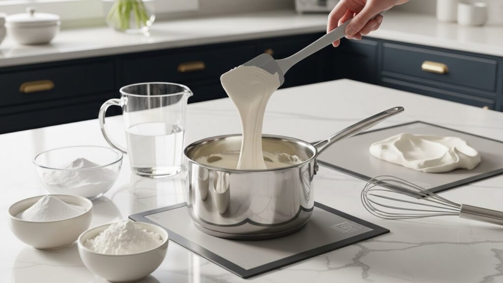 As the mixture heats, it will thicken into a smooth paste and gradually turn into a dough.