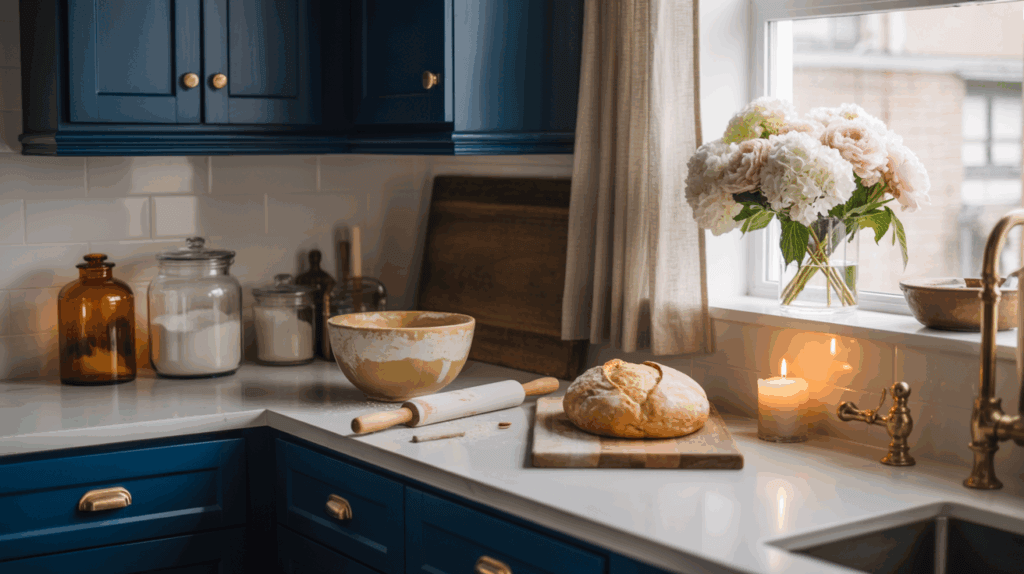 Think soft lighting, rustic textures, natural wood tones, and gentle scents that make baking feel like self-care.